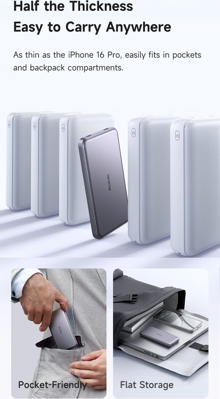 پاور بانک آلومینیومی مک دودو مدل MC-378 مجهز به انواع فناوریهای شارژ سریع است که امکان شارژ در کوتاهترین زمان ممکن را برای شما به ارمغان میآورد. با پشتیبانی از شارژ سریع PD 20W با پورت Type-C به شما این امکان را میدهد تا تنها در عرض 30 دقیقه، بتوانید آیفون 16 و هوآوی Honor 20S را تا %50 شارژ نمایید.