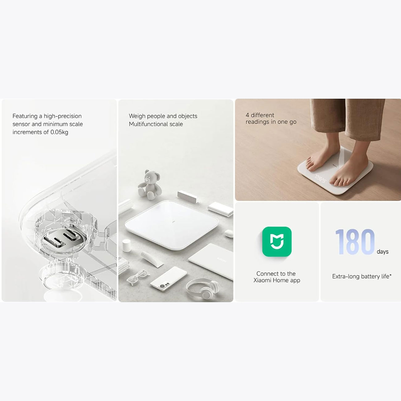 ترازوی هوشمند شیائومی S200 قادر به وزنکشی اجسام کوچک (0.1 تا 10 کیلوگرم)، حالت وزنکشی نوزاد همراه با فرد، و ارزیابی توازن بدنی است. با هر بار ایستادن، مقدار وزن، BMI، وزن استاندارد پیشنهادی و راهکارهای کنترل وزن نمایش داده میشود تا روند پیشرفت واضح باشد. حالت اندازهگیری بازدیدکننده برای ثبت موقت در دسترس قرار دارد و برای وزنگیری نوزادان، اپلیکیشن به طور خودکار وزن والد را کسر میکند تا عدد دقیقتری ارائه دهد. قابلیت تست تعادل با ایستادن روی یک پا، قدرت عضلانی و هماهنگی را ارزیابی میکند، که برای ورزشکاران یا افرادی که به ریکاوری پس از آسیب نیاز دارند، کاربردی است. این چندمنظورگی، ترازو را فراتر از یک ابزار ساده وزنکشی به یک دستیار سلامتی تبدیل میکند.